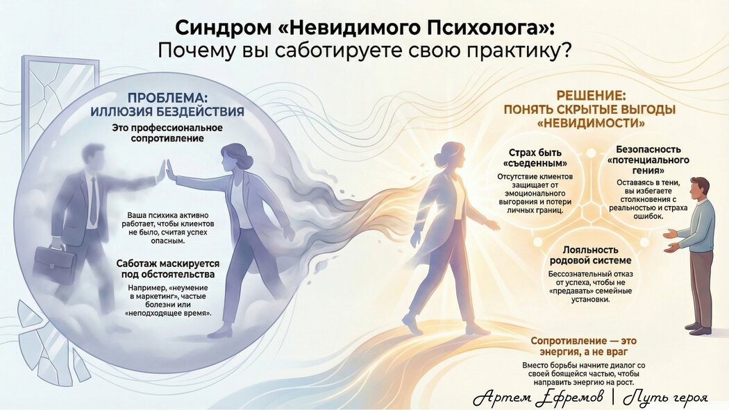 Эти трудности редко возникают из-за нехватки навыков или знаний. Срочная работа над «себя» может скрывать более глубокие проблемы — профессиональное сопротивление. Психологическая защищенность, мешающая построению успешной практики, может оказаться вполне обоснованной.