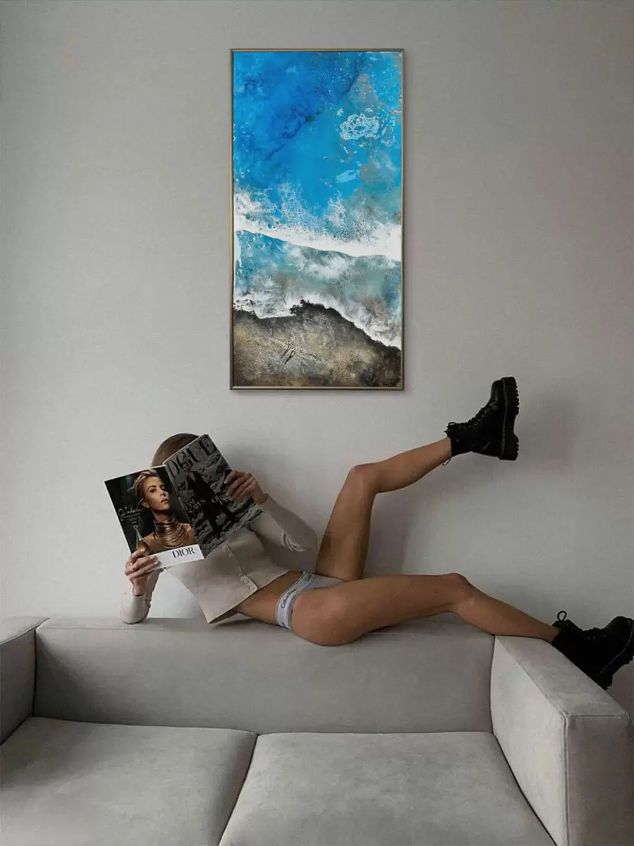 Сине-голубая палитра здесь не случайна. Эти тона известны своим мягким воздействием, способствующим расслаблению, выравниванию дыхания и возвращению ощущения пространства. Волны спокойны и несут свой естественный ритм, как бы напоминая, что жизнь может быть тише, чем мы привыкли. Фигуры на берегу едва заметны, но именно в этом кроется их сила — они не демонстрируют чувства, а просто находятся в них.