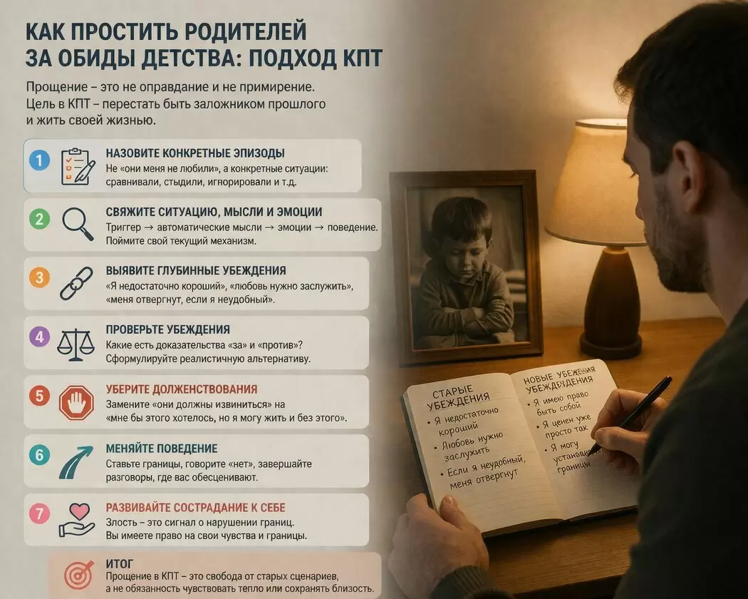 Прощение родителей — это сложный, но важный шаг на пути к эмоциональному исцелению. В контексте когнитивно-поведенческой терапии (КПТ) стоит обратиться к истокам своих обид, чтобы понять, как они влияют на текущую жизнь.