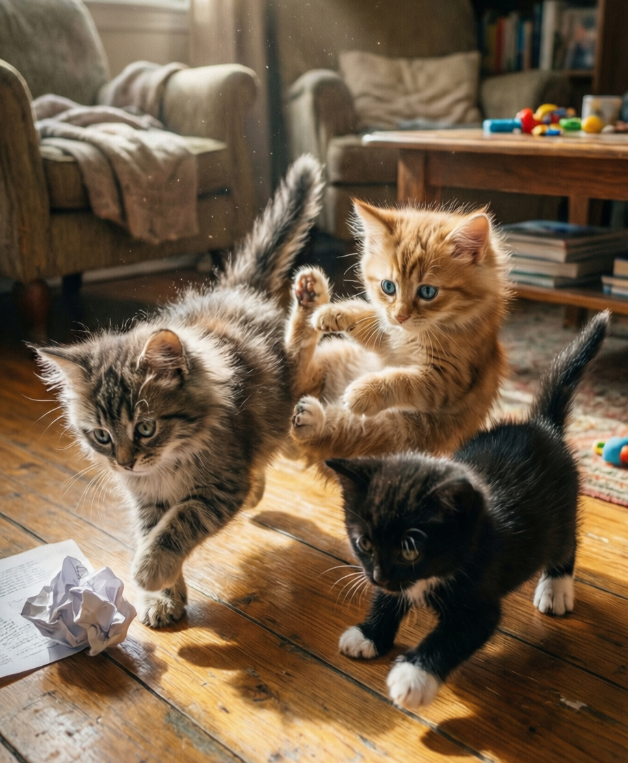 В уютном доме, где солнечные лучи мягко освещали интерьер, жил-был пушистый котёнок по имени Царапик. Его яркие зеленые глаза излучали добро, но, увы, играл он несколько необычным образом. Вместо того чтобы забавляться с друзьями, как делали другие котята, он бросался на них, цеплял лапками и пытался поймать зубами за хвост или ухо, как настоящий маленький тигр.