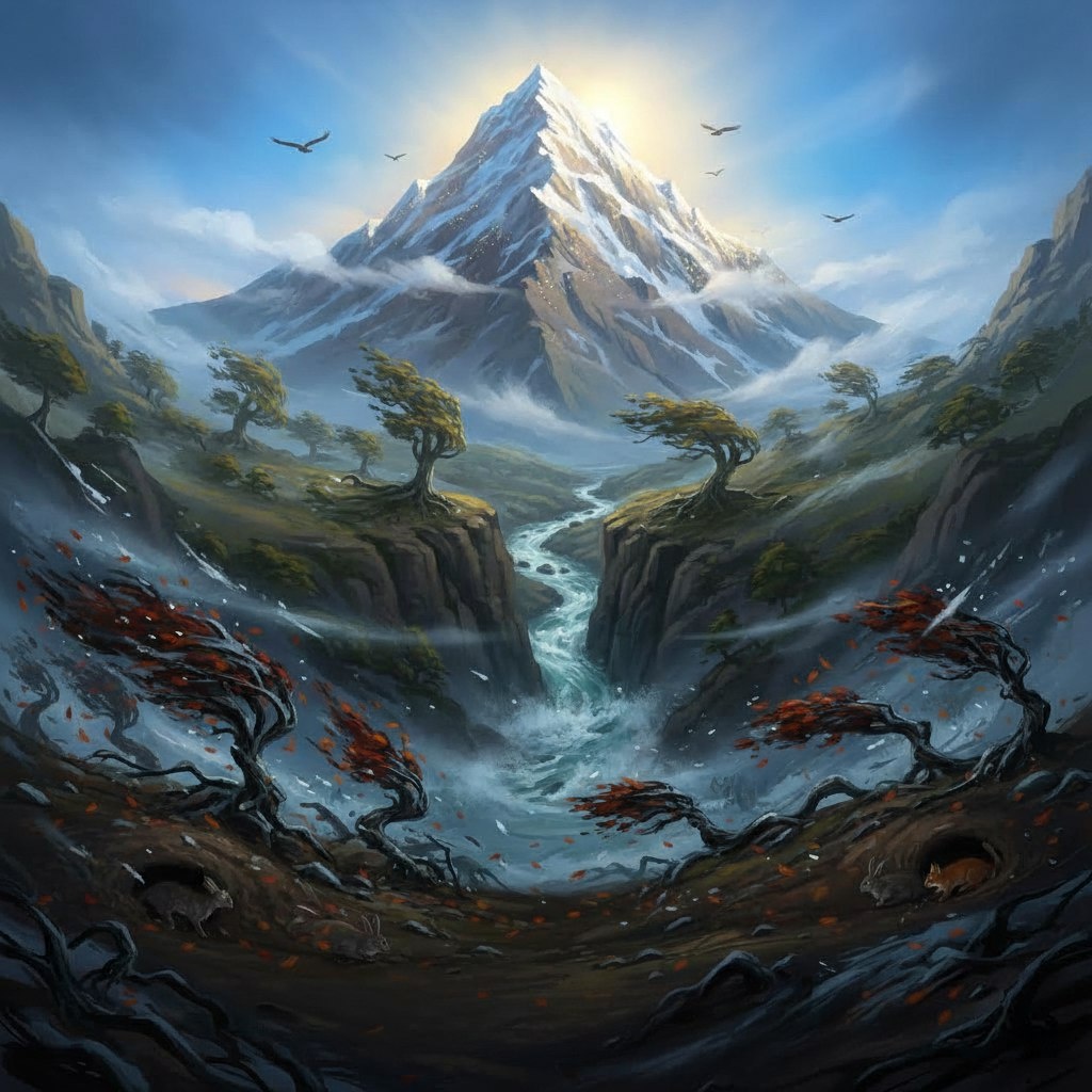 — Посмотри на меня, Ветер. У меня на склонах меняются времена года. Снег и цветы, цветы и листья — это просто циклы. Твоя буря — лишь мимолетный дождь. Если бы я начинала дрожать каждый раз, когда идёт дождь, я бы давно превратилась в камни. Я научилась одному: я есть Гора. А всё остальное приходит и уходит.