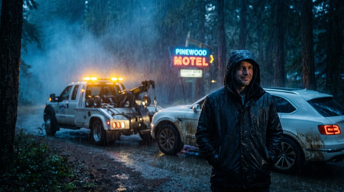 Прохладный осенний вечер с дождем, который лил как из ведра, стал фоном для неожиданной истории. Жена, взявшая машину "срочно съездить к маме", оказалась в загородном мотеле с любовником. Громкий звук предупреждающих огней эвакуатора на фоне темноты леса стал знаком конца этой затеи.